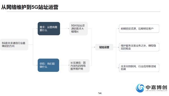 中嘉博创迎接5G时代到来,卡位站址资源,为中国5G助力6月6日,中国正式进入5G时代,中嘉博创迎接5G时代到来,卡位站址资源,为中国5G助力。5G 网络的投资规模将是巨大的,单纯依靠运营商的力量来拉动5G 的建设是不足的,我们民营企业也有机会参与的5G 网络投资建设中,助力中国的5G发展走在全球前列。 5G 通信站址运营服务,也正是为未来5G 时代面临新增海量基站的建设需求做储备,帮助运营商或者铁塔公司更快更好的完成5G 网络建设;传统的通信网络,都是先服务于个人客户的,先满足通信的需求,再通过个人客户形式形成群体优势,进入传统行业的;未来的5G 网络,是直接面向社会的,在网络的边缘为社会智能化网络服务提供了新的平台,我们希望是一个开放的平台,共建的平台。 5G的技术已经成熟,网络的建设也即将启动,未来5G会给社会带来什么样的变革,又有什么样的模式脱颖而出我们还在观察。但是可以期待的是,5G的到来会改变现在的互联网的中心化分发模式,流量的分发、用户的选择将会更加多元化,各种新技术如区块链、人工智能的成熟将创造出不同场景下新的机遇。 我们的全资子公司长实通信是目前国内领先的网络服务维护公司,随着运营商的投资加大,我们将直接受益于运营商资本开支的提高。当然我们也不仅仅满足于提供网络维护服务,我们也在产业链积极的横向拓展,我们近期可转债的项目里详细描述了我们在开展的站址运营项目,我们也不单纯看中站址这一单纯服务,我们认为未来5G 网络的投资规模将是巨大的,民营企业是有机会参与进去的,而站址就是一个很好的切入点。